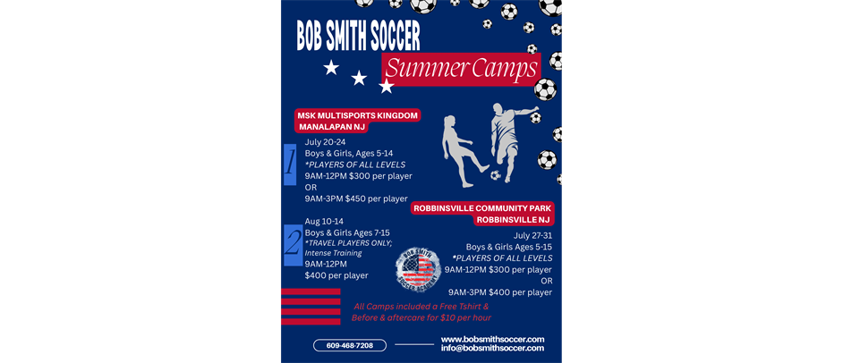 THE BOB SMITH SOCCER ACADEMY SUMMER CAMP@ MSK150 Woodward Rd Manalapan, NJ 07726INDOOR SOCCER CAMPSAGES 5-15. BOYS & GIRLSBEGINNER INTERMEDIATE OR TRAVEL PLAYERSTRAINED BY THE AREAS BEST, QUALIFIED COACHEScall with any questions 6...